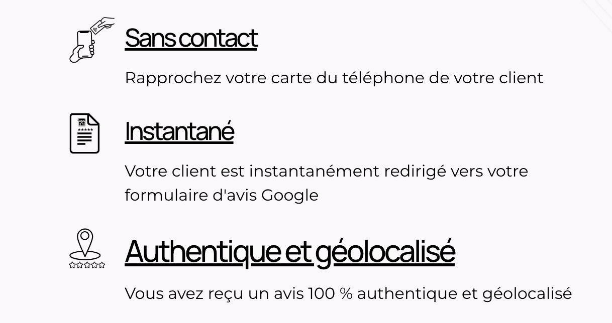 Boostez la réputation de votre entreprise avec notre carte d'avis Google. Une innovation 100% française qui utilise la technologie sans contact pour collecter des tonnes d'avis authentiques en un rien de temps